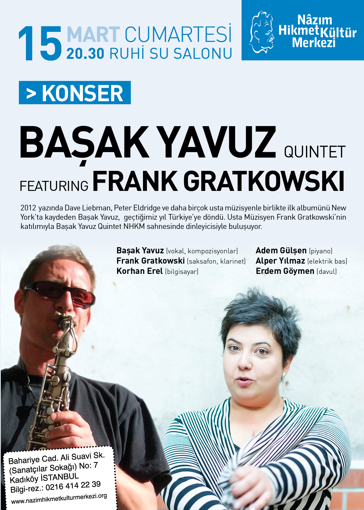 Korhan Erel has been a part of Başak Yavuz‘s jazz quintet for a while now, playing with them on and off in Istanbul. Following their concert at Cafe Mitanni last month, the quintet will play a show on March 15 featuring Berlin-based reed player Frank Gratkowski at Nazım Hikmet Kültür Merkezi in Kadıköy, İstanbul. The concert will feature compositions from Yavuz’s album Things as well as some jazz standards and freely improvised sections. Music will start at 8.30pm and tickets can be bought at the venue, which is in a beautiful building located in one of the nicest areas of Istanbul’s Asian part.