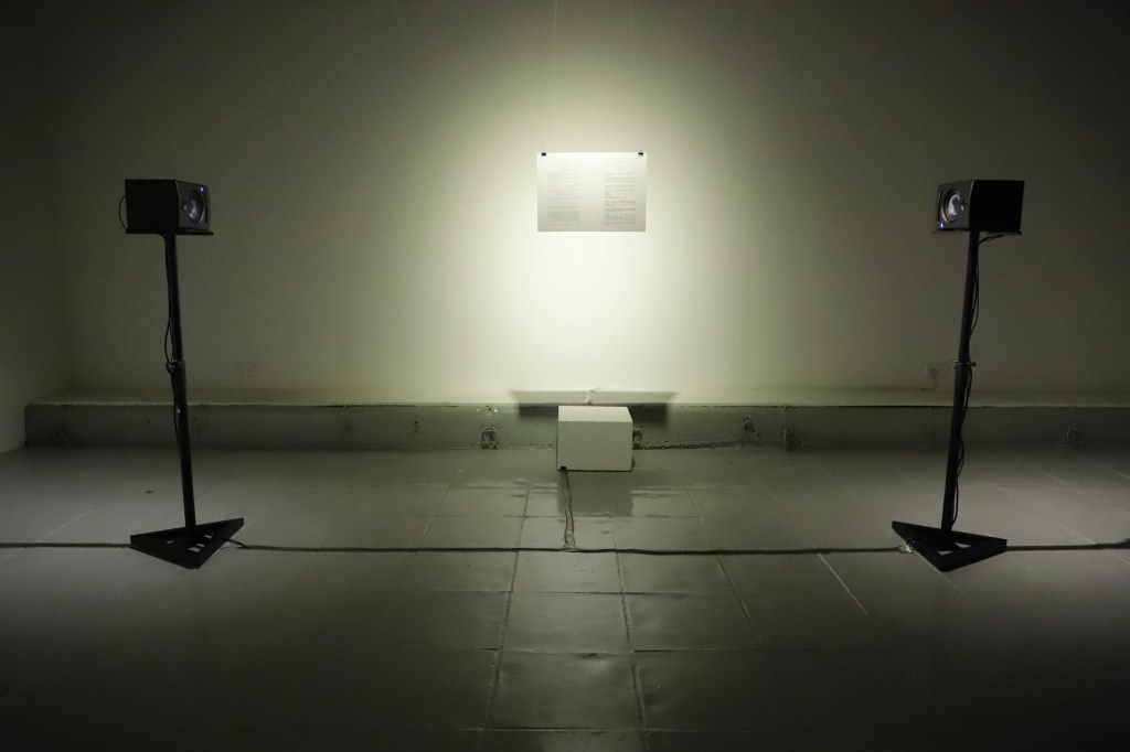 Korhan Erel made three computer voices spread over two speakers read this essay in parts. In between these parts, they inserted short sound compositions reminiscent of the computer sounds of the era, found-sound collages, snippets from Michel Foucault’s “The Culture of the Self” lectures at Berkeley (1983), and glitched versions of the manifesto in an effort to dig up and shine a new light on one of the first computer-era manifestos. The viewer experiences this sound piece by standing between two speakers pointed at each ear and in front of the printed manifesto.