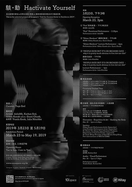 1a space proudly presents Hactivate Yourself, a contemporary art exhibition and public project curated by Tuçe Erel, the 1a space’s Call for Curator/Artist in Residence 2019 recipient. Hactivate Yourself features Istanbul-based contemporary artists AslieMk, Berlin-based Korhan Erel and Göksu Kunak a.k.a. Gucci Chunk, Bochum-based artist Julia Nitschke, and Hong Kong-based artist Vvzela Kook. Hactivate Yourself is the selected project of 1a Space “Call for Curator/Artist in Residence 2019”.
